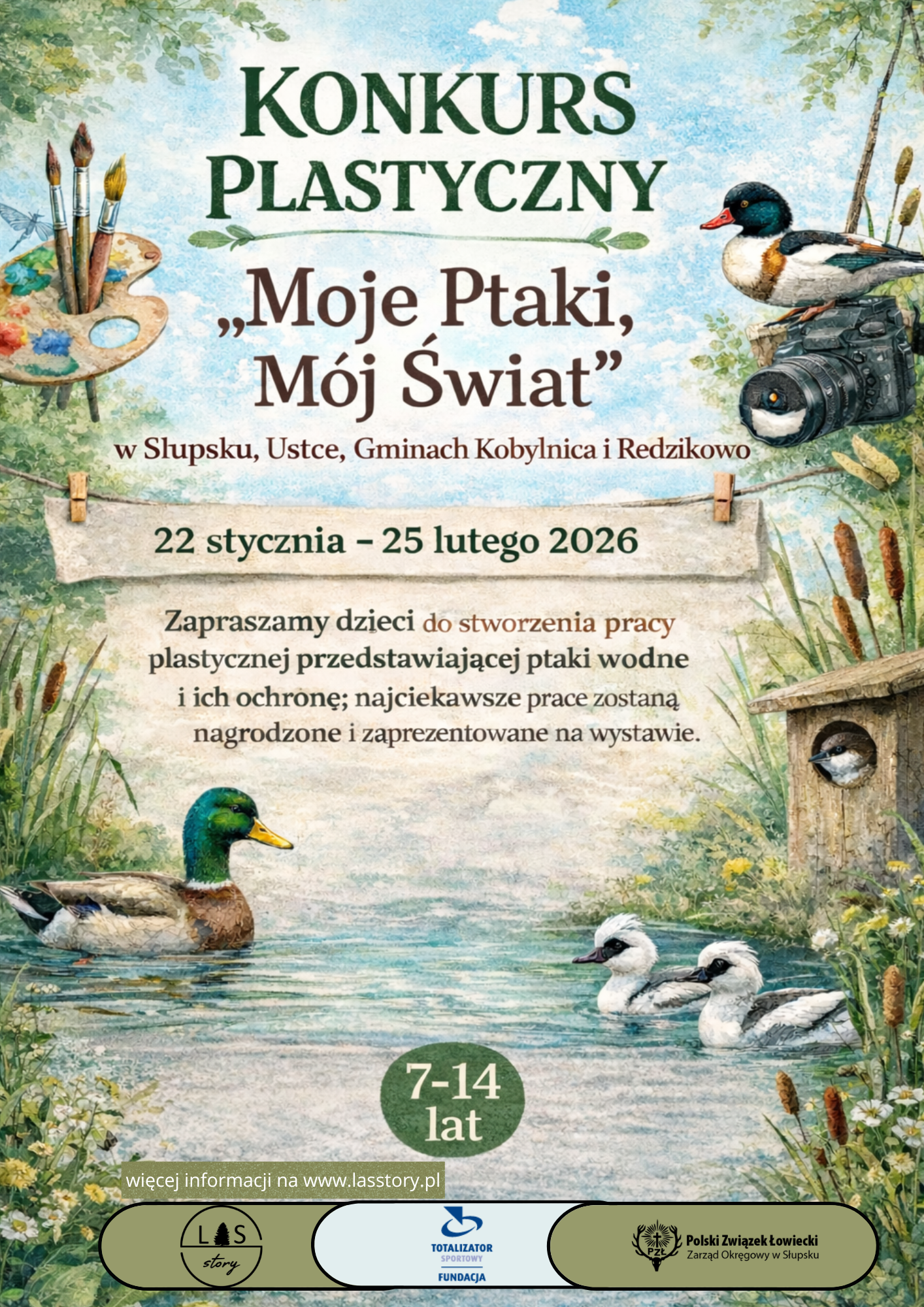Fundacja Las Story zaprasza dzieci ze szkół podstawowych oraz Edukacji Domowej z Słupska, Ustki, Gminy Kobylnica i Gminy Redzikowo do udziału w konkursie plastycznym „Moje Ptaki, Mój Świat” w ramach projektu „Gągoł i spółka – edukacyjna misja ochrona ptaków wodnych”